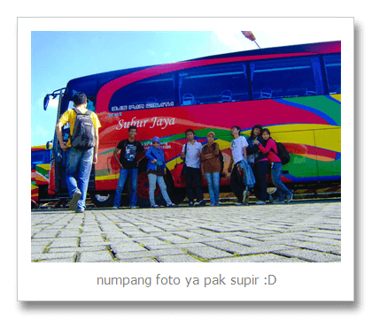 kami menyempatkan diri berfoto di sebuah bus pariwisata yang terparkir di salah satu sudut parkiran tersebut.