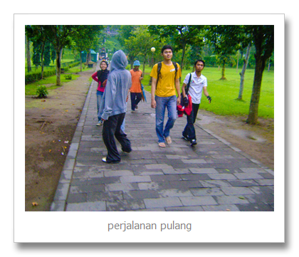 setelah dirasa puas bergila-gilaan (sekali lagi, saya tidak termasuk), kami segera menuju tempat parkir kendaraan kami.