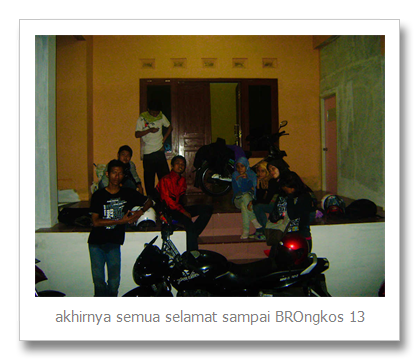perjalanan menuju semarang pada malam hari sempat ditemani hujan, dan sempat membuat rombongan sempat terputus beberapa menit. akhirnya dengan selamat tanpa ada halangan berarti, kami semua telah merapat ke BROngkos 13. setelah berfoto bersama, saatnya kami kembali ke tempat tinggal masing –masing.